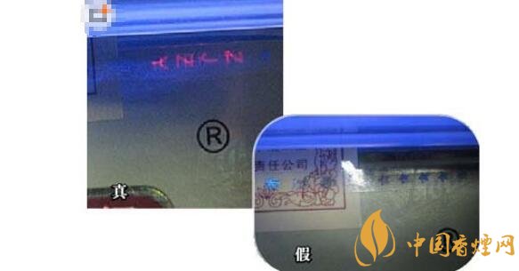 5、小盒拉線。真煙的小盒拉線有麻點(diǎn),且拉線上的字是膠印;假煙的小盒拉線沒有麻點(diǎn),拉線上的字為凹印(上真下假)。