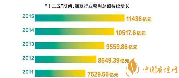 就“十二五”期間,煙草行業(yè)稅利占國家財政收入的比重保持平穩(wěn),始終保持在7.2%~7.5%的較高水平。五年上繳財政總額4.13萬億元,年均增長17.5%,比同期全國財政收入年均增長率高4.7個百分點。2015年,在經濟下行壓力持續(xù)加大的情況下,煙草行業(yè)為國家財政增收做出了更大貢獻,充分體現了國家財政收入“蓄水池”的功能。