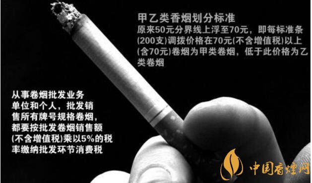 甲類卷煙(調撥價70元或以上/條):稅率56%,另收0.003元/支,于生產環(huán)節(jié)征收;乙類卷煙(調撥價低于70元/條):稅率36%,另收0.003元/支,于生產環(huán)節(jié)征收;