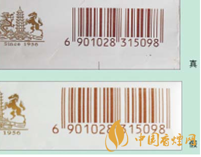 3.真品卷煙小盒條碼線條均勻,較細(xì),立體感強(qiáng),色彩飽和度好;假冒卷煙小盒條碼線條較粗,色彩不均勻,立體感差。