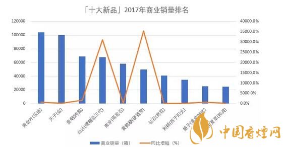 以商業(yè)銷量衡量,「十大新品」2017年合計銷量57.4萬箱,同比增加40.1萬箱,增長230.8%;十款產(chǎn)品的平均銷量突破5萬箱,平均增量達(dá)到4萬箱;銷量最大的「黃金葉(樂途)」突破10萬箱,最小的「冬蟲夏草(和潤)」也有2.4萬箱;增量最大的「黃金葉(樂途)」超過9萬箱,最少的「利群(西子陽光)」同比增加1.1萬箱。