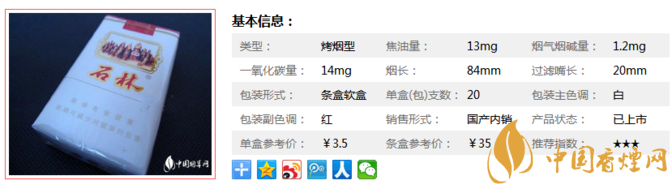 石林軟香煙已經停產,但是經典是不可超越的,下面我們一起來看看它的參數信息。煙長84mm,焦油量13mg,煙堿量1.2mg,一氧化碳量14mg。