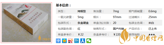 類型 :烤煙型 焦油量 :7mg 煙氣煙堿量 :0.6mg 一氧化碳量 :5mg