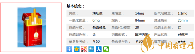 | 類型 :烤煙型 | 焦油量 :14mg | 煙氣煙堿量 :1.1mg | 一氧化碳量 :12mg |