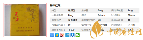 | 類型 :烤煙型 | 焦油量 :8mg | 煙氣煙堿量 :1mg | 一氧化碳量 :8mg |