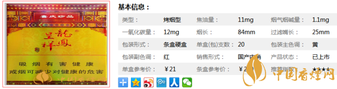 龍鳳呈祥硬珍品煙支長84mm,提質(zhì)改造后的龍鳳呈祥(喜慶珍品)香煙,全面應(yīng)用具有自主知識產(chǎn)權(quán)、獲四項(xiàng)國家發(fā)明專利的復(fù)合生化制劑綜合減害技術(shù),在保持中式卷煙特有香氣與醇厚吃味和諧的同時,能使煙氣中主要有害成分降低30%以上。下面我們一起來看龍鳳呈祥硬珍品的參數(shù)信息:焦油量:11mg. 煙堿量:1.1mg. 一氧化碳量:12mg.