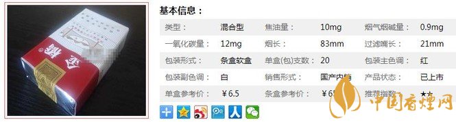 類型 :混合型 焦油量 :10mg 煙氣煙堿量 :0.9mg 一氧化碳量 :12mg