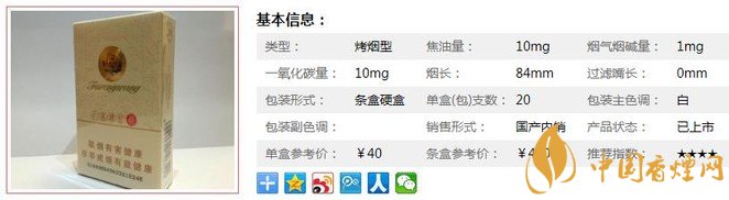 類(lèi)型 :烤煙型 焦油量 :10mg 煙氣煙堿量 :1mg 一氧化碳量 :10mg