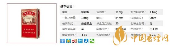 類型 :烤煙型 焦油量 :11mg 煙氣煙堿量 :1.1mg 一氧化碳量 :13mg