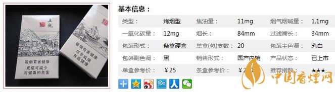 | 類型 :烤煙型 | 焦油量 :11mg | 煙氣煙堿量 :1.1mg | 一氧化碳量 :12mg |