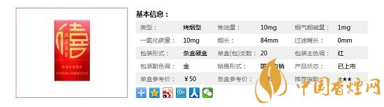 類(lèi)型 :烤煙型 焦油量 :10mg 煙氣煙堿量 :1mg 一氧化碳量 :10mg