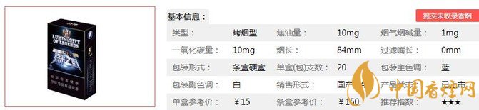 類型 :烤煙型 焦油量 :10mg 煙氣煙堿量 :1mg 一氧化碳量 :10mg