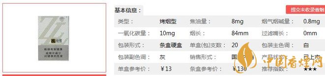 | 類型 :烤煙型 | 焦油量 :8mg | 煙氣煙堿量 :0.8mg | 一氧化碳量 :10mg |