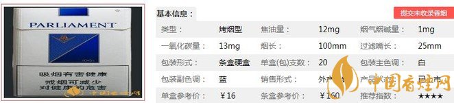 百樂門藍煙支長100mm,過濾嘴:22mm,濾嘴前端銀色的圓環(huán)圍繞著Silver Blue的銀色字樣;藍色的PARLIAMENT;上面是百樂門箭型的Logo。非常喜歡的煙支Logo設(shè)計,簡潔而漂亮!下面我們一起來看百樂門藍的參數(shù)信息:焦油量:12mg 煙堿量:1mg 一氧化碳量:13mg