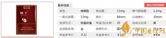 嬌子軟紫國(guó)寶煙支長(zhǎng)84mm,過(guò)濾嘴長(zhǎng):30mm,該款產(chǎn)品采用了具有自主知識(shí)產(chǎn)權(quán)的復(fù)合生化減害技術(shù),能夠明顯降低煙氣中的有害物質(zhì)。下面我們一起來(lái)看嬌子軟紫國(guó)寶的參數(shù)信息:焦油量:13mg 煙堿量:1.2mg 一氧化碳量:13mg