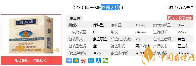 以上便是由香煙網(wǎng)小編為大家介紹的關(guān)于金圣(滕王閣·回味無窮)多少錢一包 回味無窮口感及參數(shù)介紹的相關(guān)信息,想要了解更多有關(guān)內(nèi)容請(qǐng)點(diǎn)擊:阿里山香煙好抽嗎 六款阿里山香煙口感分析