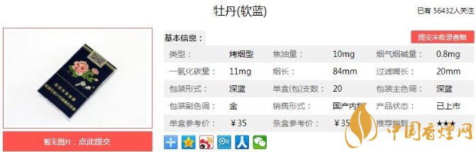 以上便是香煙網(wǎng)小編為大家介紹的關(guān)于清新包裝優(yōu)雅煙香,牡丹軟藍(lán)的價(jià)格35元一包!的相關(guān)信息,看完之后大家是不是對(duì)于牡丹(軟藍(lán))的相關(guān)信息更加了解呢。大家還想查詢更多的相關(guān)內(nèi)容歡迎點(diǎn)擊:牡丹金細(xì)支多少錢(qián)一包 牡丹金細(xì)支口感及參數(shù)介紹