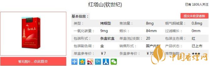軟世紀香煙秉承以人為本的設計理念,煙氣煙堿量力求達到均衡狀態(tài)。煙支采用獨特的煙紙設計,健康環(huán)保,還可以使保存的時間更久。下面便是紅塔山(軟世紀)的基本參數(shù):焦油量:8mg 煙堿量:0.8mg 一氧化碳量:9mg.