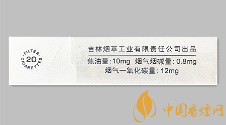 類型 :烤煙型 焦油量 :10mg 煙氣煙堿量 :0.8mg 一氧化碳量 :12mg
