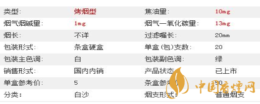 | 類(lèi)型 :烤煙型 | 焦油量 :11mg | 煙氣煙堿量 :1.1mg | 一氧化碳量 :13mg |