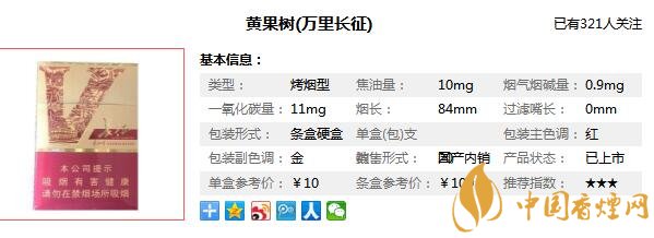 類型 :烤煙型 焦油量 :10mg 煙氣煙堿量 :0.9mg 一氧化碳量 :11mg