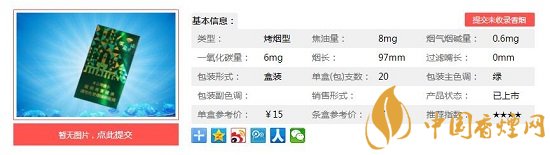 | 類型 :烤煙型 | 焦油量 :8mg | 煙氣煙堿量 :0.6mg | 一氧化碳量 :6mg |