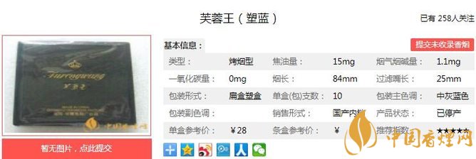 芙蓉王塑藍煙支長84mm,過濾嘴長:25mm,包裝設(shè)計大氣精致,十支包裝突顯此煙的與眾不同,可謂支支珍貴。下面我們一起來看芙蓉王塑藍的參數(shù)信息:焦油量:15mg 煙堿量:1.1mg