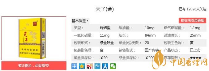 天子金煙支長85mm,過濾嘴長25mm,選用優(yōu)質(zhì)進(jìn)口凹槽嘴棒,采用濾嘴通風(fēng)技術(shù),有效降低了煙氣中有害物質(zhì)的含量,順應(yīng)了目前降焦減害的發(fā)展方向。下面我們一起來看天子金的參數(shù)信息:焦油量:10mg 煙堿量:1.1mg 一氧化碳量:11mg
