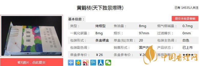 黃鶴樓天下勝景爆珠煙支長97mm,運用中國獨有的木桶薰蒸技術(shù),形成了煙草本香與生姜植物的有機(jī)結(jié)合。下面我們一起來看黃鶴樓天下勝景爆珠的參數(shù)信息:焦油量:8mg 煙堿量:0.7mg 一氧化碳量:8mg