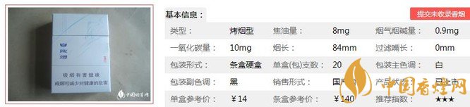 | 煙長(zhǎng):84mm | 過(guò)濾嘴長(zhǎng):25mm | 包裝形式:條盒硬盒 | 單盒(包)支數(shù):20 |