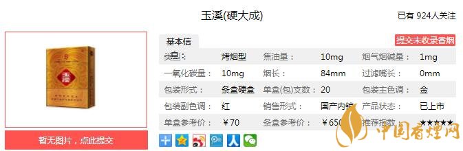大成玉溪,匯集紅塔人50年造煙智慧和工藝,背負(fù)著500年的歷史使命,開創(chuàng)中式卷煙“清香盛世”。大成玉溪,以其八部天香,構(gòu)筑世紀(jì)清香經(jīng)緯;煙支的絲縷之間,都浸透了自然的靈性與科技的精妙。八部天香,以藝術(shù)的節(jié)奏,完成對清香的詮釋,重新定義中式卷煙清香標(biāo)準(zhǔn)。經(jīng)香煙網(wǎng)小編市場調(diào)查玉溪硬大成售價(jià)為70元/包。