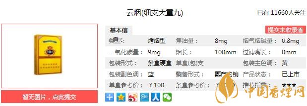 一、云煙(細(xì)支大重九)香煙價格
