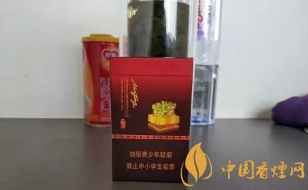 盒子的中間,一顆金黃色的玉璽,顯示了它的尊貴的身份,玉璽圖案的右邊是一枚仿古的印章,內(nèi)有“古都”兩個(gè)字,在圖案的下面是好像是一條鑲著寶石的腰帶。煙盒下面三分之一的面積,按照慣例還是警示語標(biāo)識,警示語為本公司提示版,屬于比較新的一款。