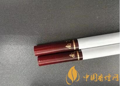 從盒子里面抽出兩支煙來,放置于桌上,觀之,煙嘴的顏色和煙盒的顏色也是一樣,采用了漸變色,紅褐色的煙嘴中間有兩排不怎么明顯的降焦孔。煙嘴的長度為32毫米,而整個(gè)煙支的長度還是普通的84毫米。煙嘴下部有南京二字和印有古都兩個(gè)字的印章圖案。一道閃閃發(fā)光的金箍環(huán)繞著整個(gè)煙嘴。