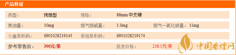 類型 :烤煙型 焦油量 :12mg 煙氣煙堿量 :0.9mg 一氧化碳量 :12mg
