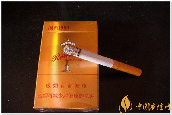 打開煙盒,首先看到的是錫紙上國典1959字樣??拷宦?,挺清爽的煙草香,帶點涼清酸爽的氣味。手捏煙支,感覺充實,煙絲的色澤鮮艷。過濾嘴是金黃色的,上有““人民大會堂”的字樣。過濾嘴裙帶處有一道白金色的金箍,金箍下是“國典1959”字體。