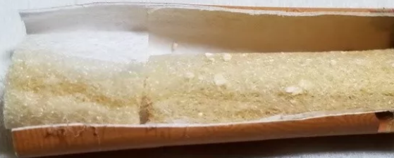 剖開濾嘴...是兩段式濾嘴,前段占據(jù)2/3,絲束里夾雜細(xì)碎的白色顆粒,想來是細(xì)微甜。濾嘴有降焦孔,基本開在了整個(gè)濾嘴的中段位置。從兩段絲束的顏色變化來看,基本均勻,略微變成了淡黃色。看來煙支的延燒性、空氣的介入等調(diào)節(jié)得都比較理想。香之物。