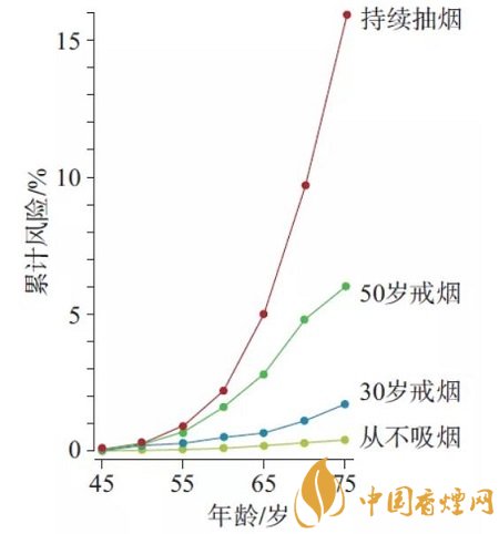 2004 年,著名的《英國(guó)癌癥雜志》 發(fā)表了經(jīng)典論文,詳細(xì)統(tǒng)計(jì)了英國(guó)等歐洲國(guó)家不同群體男性的肺癌死亡率。從圖上不難看出,75歲吸煙人群死于肺癌的概率是16%,比不吸煙人群高了將近50倍。換算一下,也就是說(shuō)6個(gè)吸煙的人里面會(huì)有1位75歲之前就死于肺癌。更可怕的是,如果每天吸煙量超過(guò)5支,那么4個(gè)人里,就會(huì)有1位死于肺癌。