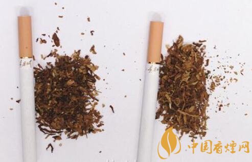 真品煙支采用單一醋纖濾嘴,長度為25mm,煙絲切絲寬度均勻,煙絲疏松、光澤油潤性好、含碎末少。煙絲結(jié)構(gòu)為葉絲、膨脹葉絲、膨脹梗絲和再造煙葉;假煙煙支過濾嘴較短,長度約為21mm,制絲工藝粗糙,光澤油潤性差、煙絲中含碎末較多,大量梗絲未經(jīng)過膨脹處理,一般無膨脹葉絲和再造煙葉,與真品特征存在明顯差異。