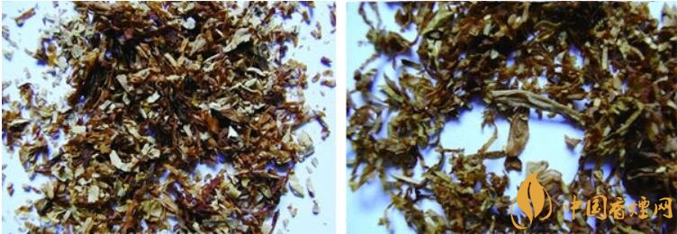 真品煙絲結(jié)構(gòu)為葉絲、膨脹葉絲,切絲寬度基本一致,色澤金黃油潤;假煙煙絲呈現(xiàn)黃褐色,切絲寬窄不一,假煙煙絲中常夾雜有膨脹梗絲,有異味,無膨脹葉絲的,切絲不均勻。