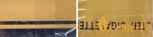1.商標字體印刷。真品卷煙商標印刷采用“凹印”,兩種顏色交界邊緣呈現虛邊或鋸齒狀。假冒卷煙商標印刷一般采用“膠印”,兩種顏色交界邊緣比較清晰、光滑,無鋸齒狀。(圖1左真右假)