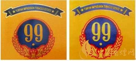 真品卷煙:1.商標(biāo)LOGO稻穗圖案凸起,整體立體、飽滿,大豐收。2.99數(shù)字筆畫圓潤、飽滿,下面圓點尤為突出。3. 藍(lán)色底紋顏色重,邊緣向中間色彩過渡自然。4.商標(biāo)紙流水紋路清晰可見。