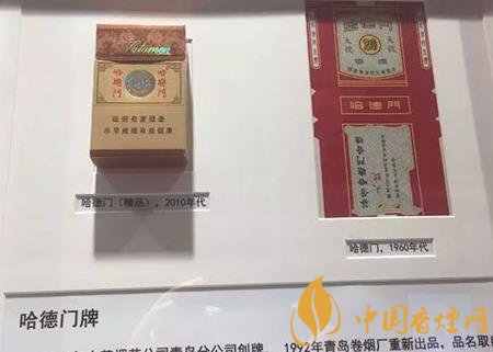 哈德門牌,1992年青島卷煙廠重新出品。品名取自北京崇文門的別名。煙標以隸書“哈德門”及“HATAMEN”標記為主圖案。