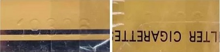 真品卷煙鋼印打印的數(shù)字感覺較為粗糙,有力度感且排列不整齊。該款假冒卷煙鋼印打印比較輕,無力度感且排列整齊。(左真右假)