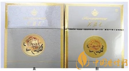 假冒卷煙“芙蓉花”圖案立體感不強(qiáng),金色長方形外邊框上無細(xì)小壓痕。