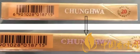 “中華”(雙中支)產(chǎn)品小盒采用硬盒(雙包)翻蓋的包裝形式,煙支規(guī)格為89mm(長)*20mm(圓周)。小盒側(cè)面英文字母“CHUNGHWA”采用熒光變色防偽油墨;在紫外光照下,白色“CHUNGHWA”會(huì)變成紫紅色,一段時(shí)間后紫紅色褪去。