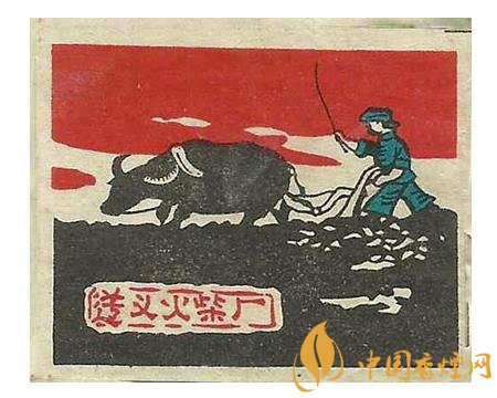 國榮火柴廠出品于同期的“大地牌”(圖3)火花,在朝霞滿天間有白云,以及數(shù)座民居背景的映襯下,突出了一名頭戴斗笠的農夫,一手扶犁一手驅牛辛勤翻耕農田的場面。