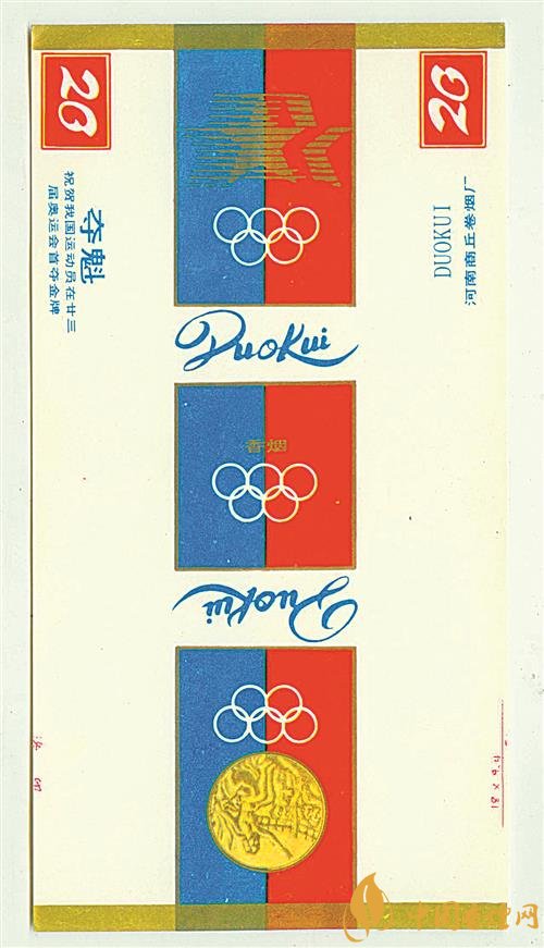 1984年,在美國洛杉磯舉行的第23屆夏季奧運會上,我國射擊運動員許海峰實現(xiàn)了我國奧運金牌零的突破。為祝賀我國運動員取得好成績,上世紀80年代,河南商丘卷煙廠出品了多個版本的“奪魁”煙標。其中一個版本的“奪魁”煙標(圖①),圖案采用紅色、藍色和金色為主要配色,主版圖案為洛杉磯奧運會會徽,左側位置印有“祝賀我國運動員在廿三屆奧運會首奪金牌”字樣,副版上印有奧運會金牌圖案和奧運五環(huán)標志。同時期,山東兗州卷煙廠出品了“五洲”煙標,主、副版圖案分別為第23屆夏季奧運會會徽和奧運五環(huán)標志。