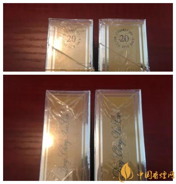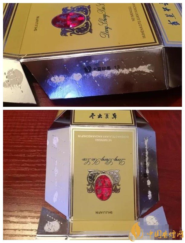冬蟲夏草煙真假鑒別小盒頂部特征;左邊為正品,有裝飾花紋,而右邊的仿品不具備此特征。