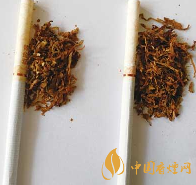 煙支及煙絲差異對(duì)比:真煙煙支的水松紙顏色偏黃,煙絲結(jié)構(gòu)為純?nèi)~絲;假煙煙支水松紙顏色偏淡,煙絲結(jié)構(gòu)為葉絲、造紙法再造煙葉,與真品特征存在明顯差異。